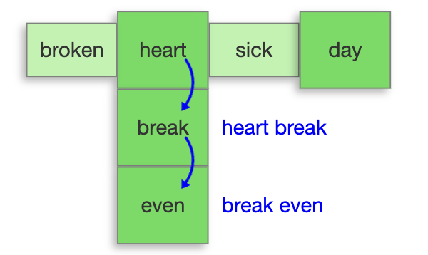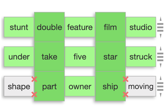 - A connected column turns dark green when all 3 words make two-word phrases going down.